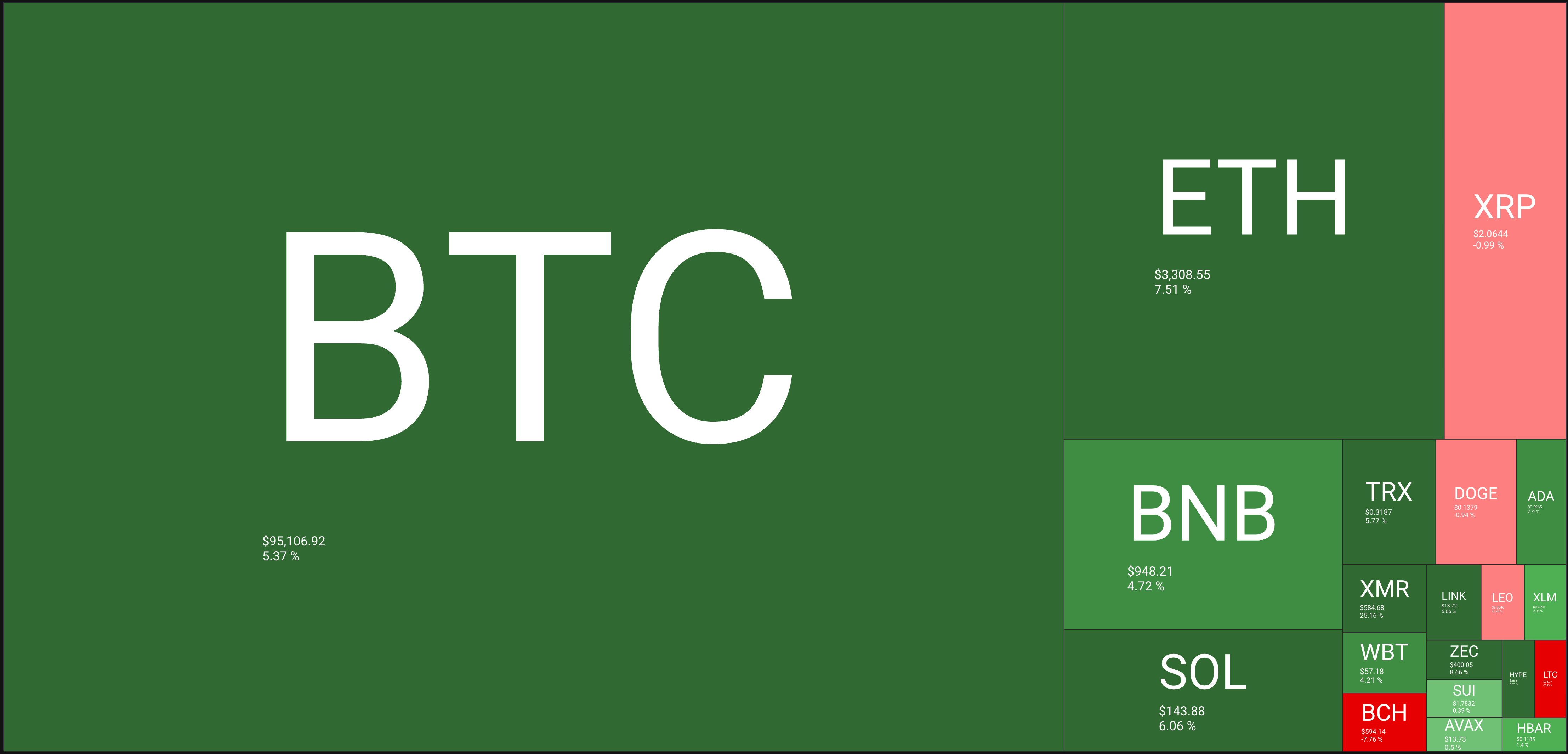 🔥🗺️Heat map shows the 7 day change in price (red down, green up) and block size is market cap.