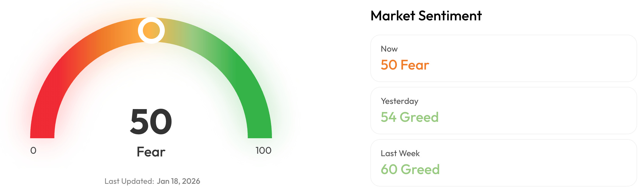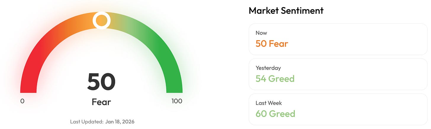 🎭 Crypto Fear and Greed Index is an insight into the underlying psychological forces that drive the market’s volatility. Sentiment reveals itself across various channels—from social media activity to Google search trends—and when analysed alongside market data, these signals provide meaningful insight into the prevailing investment climate. The Fear & Greed Index aggregates these inputs, assigning weighted value to each, and distils them into a single, unified score.